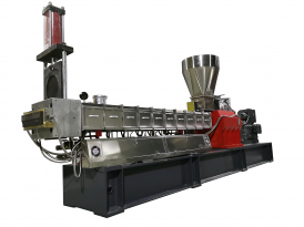 在加熱和混合的作用下,材料在擠出腔內(nèi)形成高壓狀態(tài),并通過(guò)模具的作用,將材料擠出成型,形成顆粒產(chǎn)品。主要組成部分包括驅(qū)動(dòng)系統(tǒng)、傳動(dòng)系統(tǒng)、加料系統(tǒng)、加熱冷卻系統(tǒng)、真空排氣系統(tǒng)、切粒系統(tǒng)等。